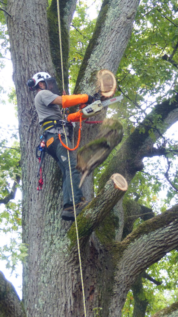 Grâce à des techniques de grimpe et de cordage précises, il intervient directement dans la cime pour tailler les branches, alléger la structure ou éliminer les parties fragilisées.